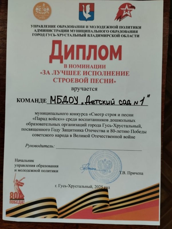 Наш детский сад получил диплом за "Лучшее исполнение строевой песни"
